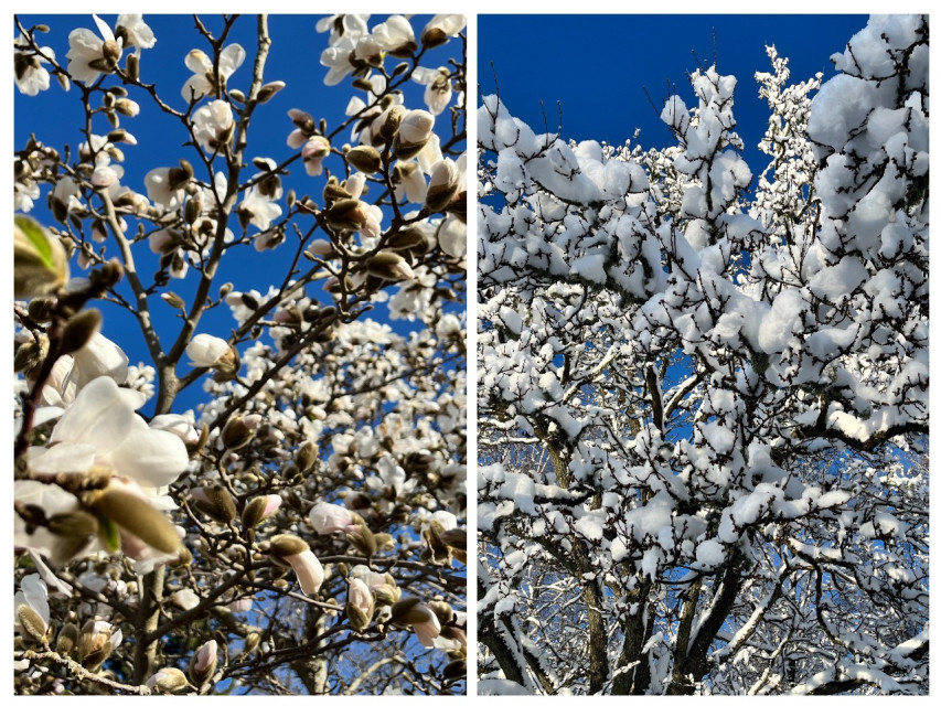 På den ena bilden står ett magnoliaträd i full vårprakt. Grenarna bär vita blommor som just slagit ut, sköra och samtidigt kraftfulla. Ett löfte om något nytt.
